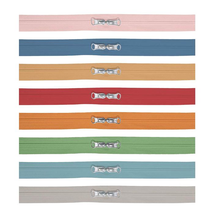 The Happy Zippers by Lori Holt of Bee in my Bonnet come in a package of 8 different zippers in Lori's fun colors. Each zipper is 1" x 16" and has 2 zipper pulls. The Happy Zippers have polyester fabric tape, zinc alloy sliders and pulls, and nylon teeth.
