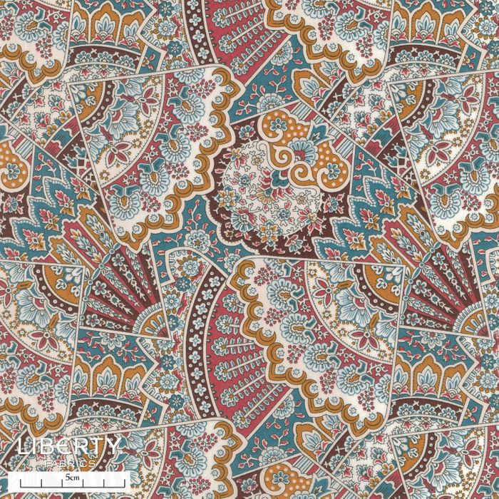 A tribute to the Liberty store as a bustling Bazaar, Emporium celebrates the exquisite craftsmanship of traditional Asian fans, which were among the earliest artefacts brought to London by Arthur Liberty in the 1880s. Inspired by an archive design, this composition weaves a rich interplay of embellished fan shapes tightly arranged into intricate, interlocking paisley style motifs.