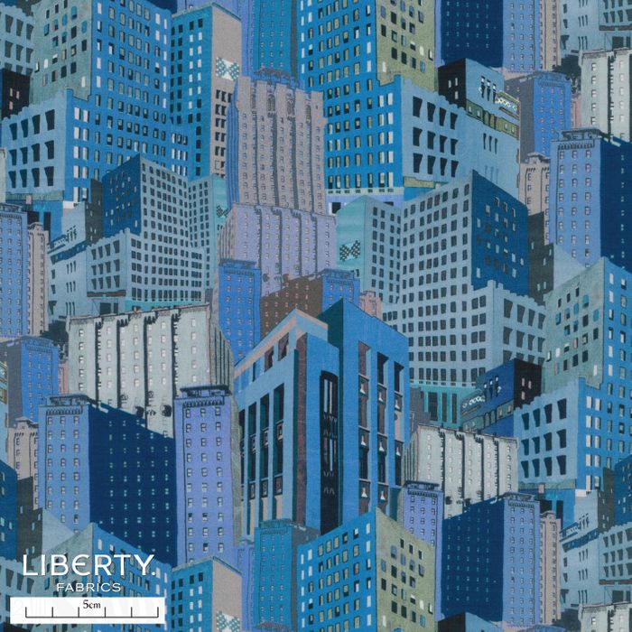 Composed from a series of Liberty scarves designed by Bernard Nevill in 1969, this striking architectural pattern features an imaginary urban landscape, filled with Art Deco style skyscrapers. Shifting between clever perspectives, these towering facades create a mesmerising interplay of light and shadow, while preserving the textures of the original 1960s print impressions.