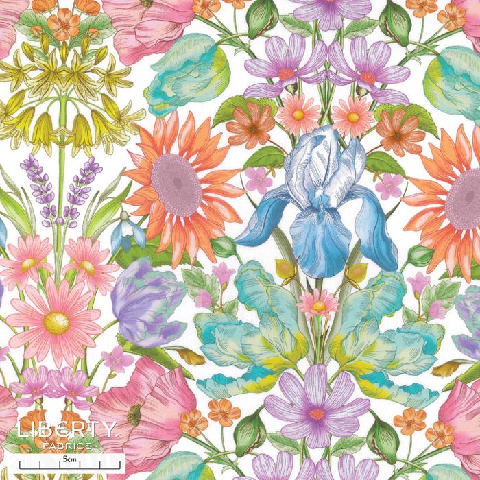 Hand drawn in the Liberty studio, this striking spring meadow is a nod to Liberty’ s Art Nouveau revival period of the 1960s. Overflowing with botanical splendour, it showcases a variety of colourful blooms including poppies, daisies, sunflowers, irises, tulips and lavender, all arranged in a synchronized mirrored pattern which forges connections between past and present.