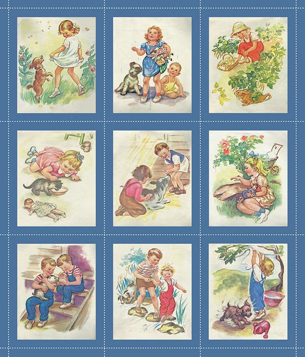 Simple Pleasures by Sandy Klop of American Jane for Riley Blake Designs is great for quilting, apparel and home decor. This digitally-printed panel features a patchwork of vintage scenes with children and animals. Panel size is 35 1/2" x 43".
