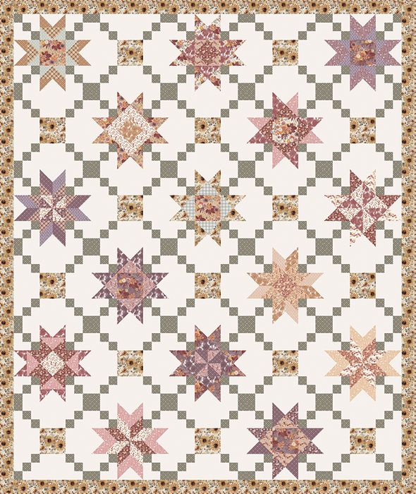 The Prairie Garden Quilt by Modern Prairie features different pieced star blocks with a chain block setting. Finished size is 96 1/2" x 114 1/2".