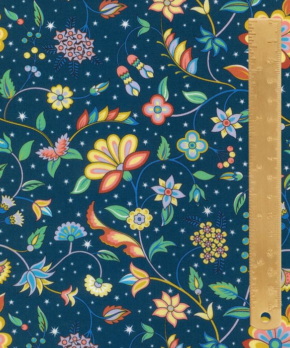 Hand drawn in ink and painted using gouache in the Liber ty studio, this design features a richly embellished floral vine, reminiscent of a traditional Tree of Life pattern. Stylised ornamental blooms and patterned leaves inter twine with blossoms, berries and buds, trailing across a star-studded night sky.