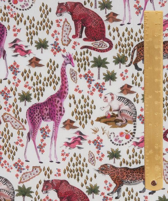 Championing the natural markings found on elegant safari animals, this design is a riot of pattern and colour. Painted in the Liberty Design Studio using gouache paints and fine brushes to add fastidious detail - leopards, giraffes, ocelots and monkeys sit within a landscape of mountains, palm trees and tiny, fragrant blossoms and fruit.