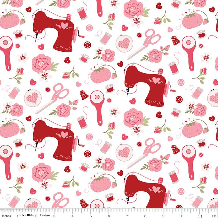 Sew in Love by Dani Mogstad for Riley Blake Designs is great for quilting, apparel and home decor. This print features flowers and sewing-themed icons such as scissors, pincushions, sewing machines, thread, and more.
