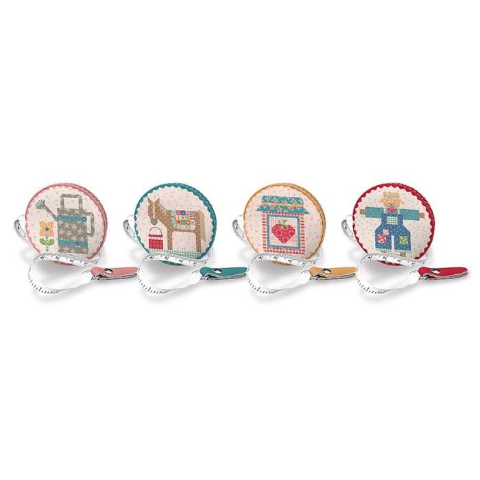This counter display includes 24 tape measures that were designed by Lori Holt of Bee in my Bonnet with blocks from her Farm Fresh Sew Along Quilt. The 60" vinyl-covered, retractable tape measures feature both inches and centimeters. Spot clean only. Approximate tape measure size is 2 3/4" x 2 3/4" x 3/4".