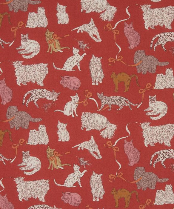 This charming conversational pattern features characterful cats of various breeds, playfully observing, relaxing, and interacting. Inspired by the beloved Liberty design Meow, this delightful new rendition showcases cats owned by Liberty staff members in Japan and the UK. Illustrated in pencil, the design imagines the cats playing amongst ribbons and bows, capturing their whimsical personalities.