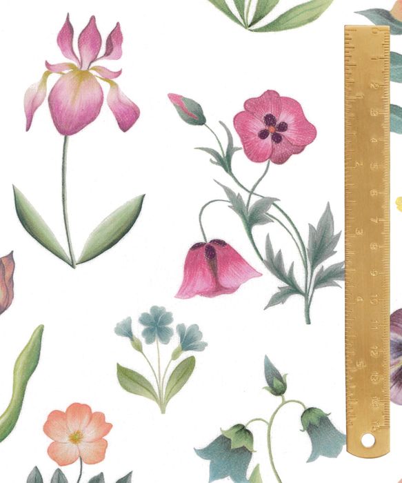 With gowns adorned with rich fabrics, elaborate embroideries, and exquisite jewels, fashion in the Regency period symbolised weatlh and power. Floral Majesty features pansies, poppies, buttercups, irises and bluebells, drawing inspiration from the layout and extravagant motifs embroidered into one of Elizabeth I's dresses. The design was hand-painted using pastels on textured paper, adding depth and richness to its vibrant floral imagery.