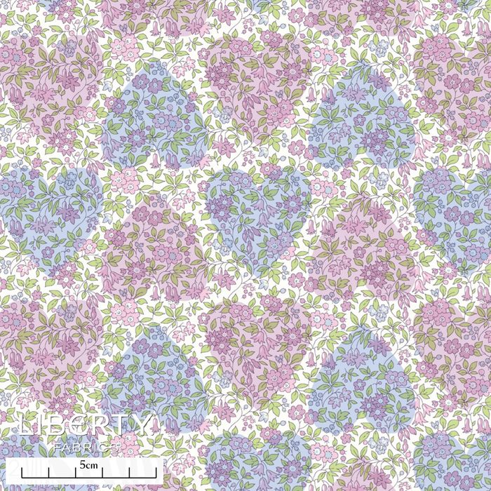 Using the beloved Chamomile print as a floral backdrop, this whimsical rendition introduces transparent, alternating hearts for a playful touch. Comprising of tiny berries and simplified trailing flowers including forget-me-nots, daisies, and bluebells, this quintessential Liberty botanical finds its roots in an archival 1950s pattern.