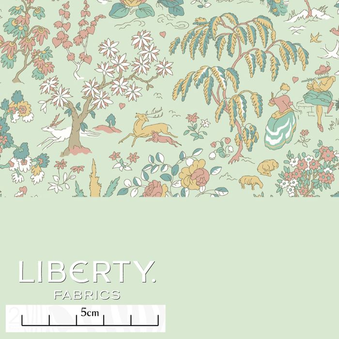 Originally introduced as a Liberty furnishing fabric in 1931, Liddel Garden has been reimagined into a picturesque landscape tableau. Scenic countryside vistas unveil pockets of romantic rural scenes, from dancing ladies and pastoral musicians to blossoming trees, leaping stags, and majestic peacocks. This idyllic, folk-inspired design beautifully captures a joyful connection to nature.