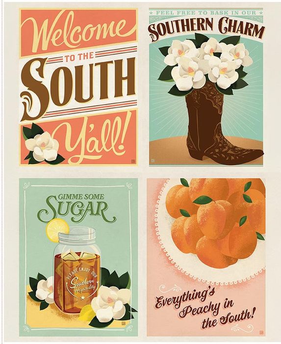 Southern Charm by the RBD Designers for Riley Blake Designs is great for quilting, apparel and home decor. This digitally-printed panel by Anderson Design Group features a patchwork of vintage-style southern sayings, flowers, fruit, and charming icons. Panel size is 35 1/2" x 43 1/2".