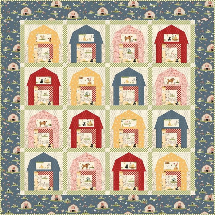 The I Spy Farm Quilt Kit includes pattern and fabric for quilt top and binding. Backing not included. Fabric featured is Lil' Farm Friends by Kelsey Carlson. Pattern is by Poorhouse Quilt Designs. Finished size is 50 1/2" x 50 1/2". Kit comes in a collector box. Box size is approximately 11" x 12 1/4" x 3 1/2".