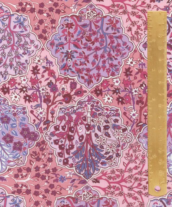 Derived from a Liberty scarf design originally printed in the late 1980s, Aspley Tile features a highly ornamental composition influenced by traditional Persian and Middle Eastern motifs. Meticulously detailed flowering trees are framed within intricate medallion shapes, evoking the richness of a finely woven patchwork tapestry.